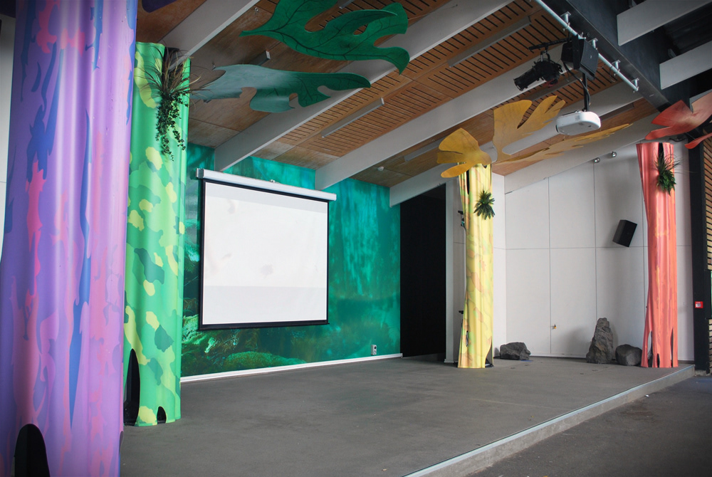 The challenge for this project was to brighten and add interest to a large, sparse area that can be cold and dark at times. The method of creating tree trunks out of vinyl allowed us to utilise the height of the space (up to 6m for the largest trees) and add vibrant colour. Combined with the large suspended leaves, full back wall print and epiphyte details, we created an engaging space that compliments the shows and presentations the theatre is used for.